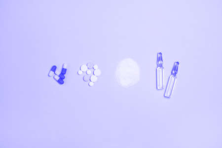 Different medications as a pills, ampule injections and powder on lilac background. Pharmaceutical industry, medicine, treatment and recovery after illness.