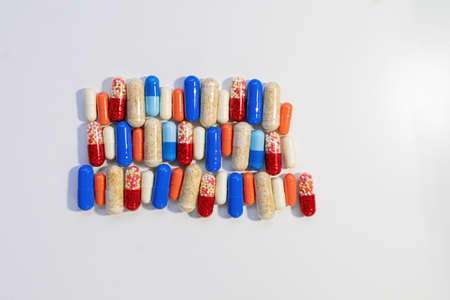 Colorful capsule pills on isolated white background with copy space. Antibiotic drug resistance. Pharmaceutical industry. Antimicrobial resistance concept. Top view.
