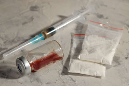 addictive drugs. heroin and cocaine are not light concrete background. The concept of drug addiction.