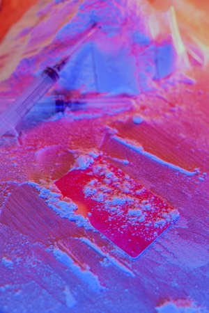 Drugs, drug dealer house. Cocaine packaged in sachets, scales: tablets and syringes in neon light. Illegal, entry.