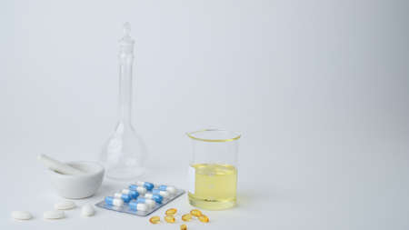 medicine and laboratory glassware for pharmacy and scientific content .