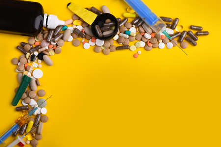 different pills and capsules scattered on a yellow background, space for text
