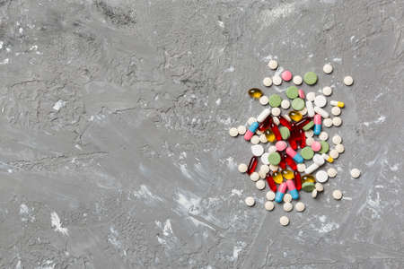Many Colorful Pills and Tablets Medicine Drug on Copy Space Background.