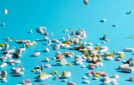 A lot of colorfull medication pills, painkillers o vitamins falling down on the blue background