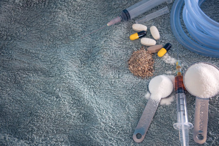 Pills, prohibited substances, addiction, say no to drugs. Drug addiction and substance concept.