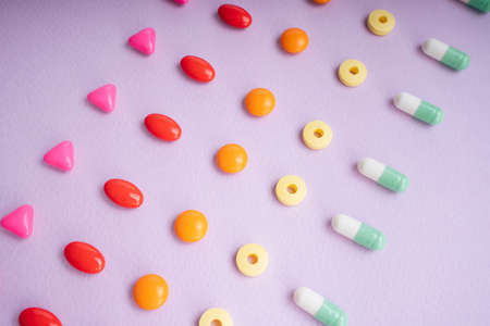Top view - colourful medicine pills over pastel background.