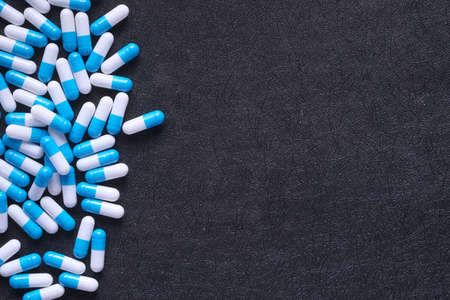 white and blue capsule spilling on black background with copy space