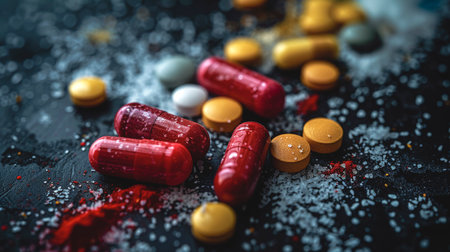 many colorful pills and capsules spilling on a black background