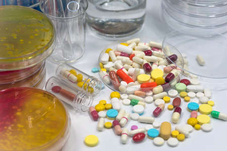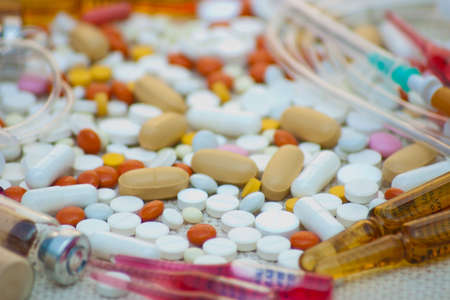 Heap of assorted pharmaceutical medicine pills in tablets and capsules different colors, medication