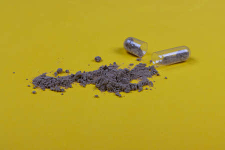 Macro photo of yellow powder from an open medical capsule