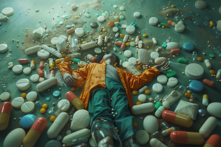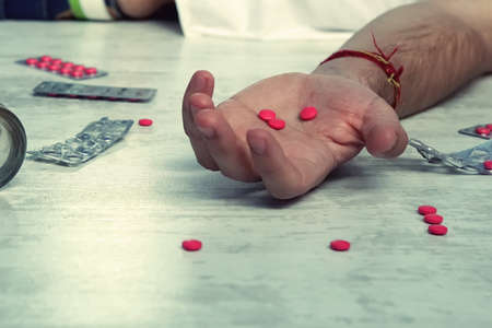 man lying unconscious from an overdose of pills, red tablets in the hand of a young man. concept of suicide, poisoning from pills, drug overdose