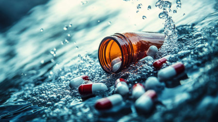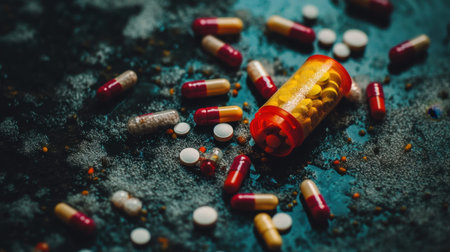medicine pill tablets spill from medical bottle container on floor in abuse or health vitamins supplement concept