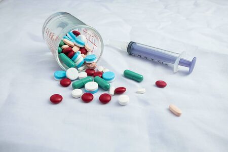 Various medicines are scattered on a light surface