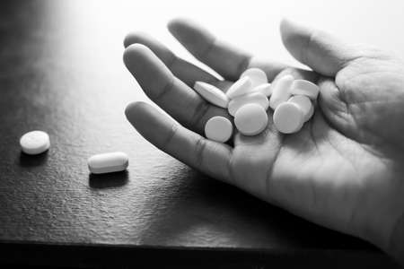 Black and whith of drug in palm up. dangerous drug, overdose, poor health. Substance Abuse concept.