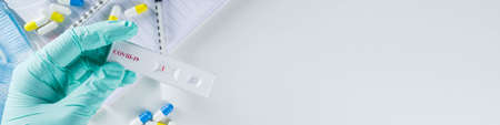 Worldwide coronavirus epidemic concept. Pandemic COVID-19, 2019-nCoV. Laboratory test strip for antibody or sars-cov-2 virus disease. In doctor hands. With pills, vaccination syringes, notebook.