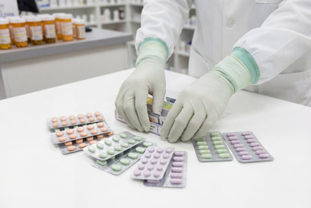 A pharmacist wearing protective gloves arranges colorful blister packs of medication and prescription drugs on a sterile white counter inside a professional medical dispensary.
