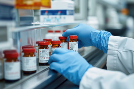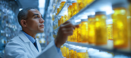 A professional pharmacist in a sterile pharmacy room examines medication bottles on a shelf. The image features sharp focus and cool lighting, highlighting the clinical environment.