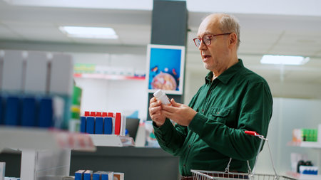 Male senior client checking package of cardiology pills to buy prescription medicaments from pharmacy shelves. Old man looking at vitamins boxes to buy supplements, healthcare. Handheld shot.