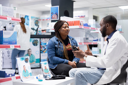 African american pharmacist consulting a client in the drugstore retail, assisting in giving professional advice and guidance for wellness. Apothecary service at pharmacy visit.