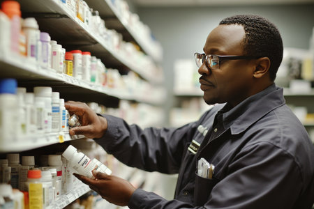 Concentrated pharmacist searching for medications on shelves in a modern pharmacy, ensuring patients receive the right treatment