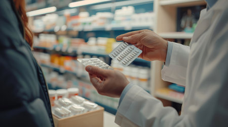 Pharmacist handing a blister pack of pills to a customer in a brightly lit pharmacy. Professional healthcare service and medical consultation
