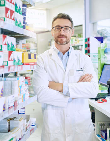 Hes equipped with the necessary skills to to improve your health. Portrait of a confident mature pharmacist working in a pharmacy.