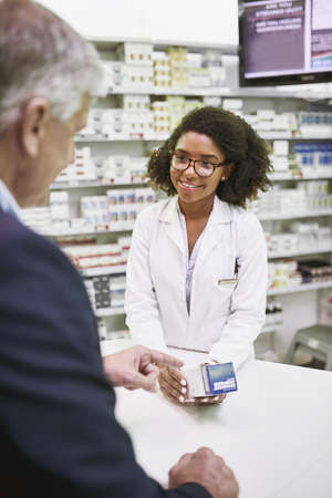This is what youre looking for. Shot of a cheerful young female pharmacist giving a customer prescription meds over the counter in a pharmacy.