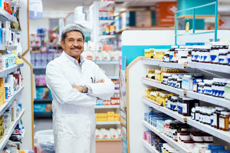Arms crossed, mature man and pharmacist at pharmacy in counter for customer service, support and help. Medical, healthcare and portrait with confidence or smile on treatment advice at drugstore