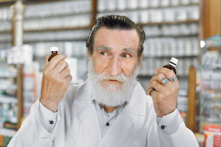 Close up portrait of pensive senior pharmacist working at ancient drugstore, holding two bottles in both hands and looking toward. Healthcare, pharmacy and medicines concept