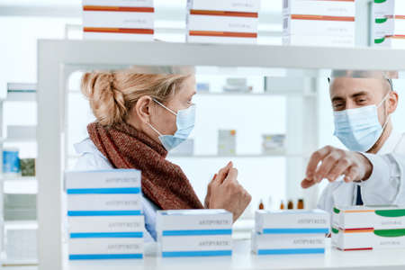 pharmacist and a customer in protective masks are talking near a pharmacy window.