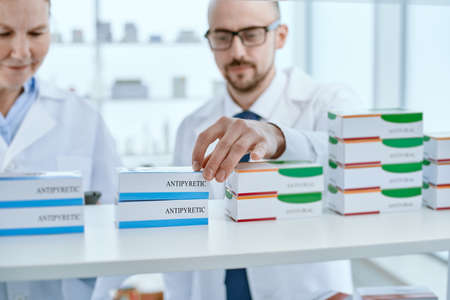 Portrait of experienced bearded man pharmacist making notes on clipboard, working with female Caucasian technician holding box of pills. Drug quality control and stocktaking.