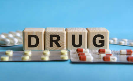 DRUG - text on cubes. Drug, tablets in blisters to reduce disease symptoms