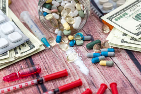 different pills, cocaine powder, dollar bills, and syringe on desk.