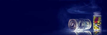 Pharmaceutical drugstore background. Banner with money and pills. American opioid plague