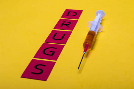 Illegal drug crisis concept showing a full syringe and the message Drugs on a yellow background