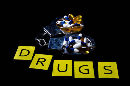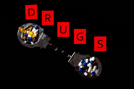Illegal drug crisis concept showing tablets, handcuffs and the message Drugs