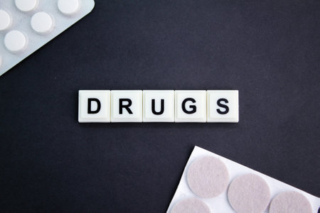 A row of small white plastic tiles, containing the letters forming the word drug, placed on a table together with tablets and capsules, to represents the concept of drug use or topic.