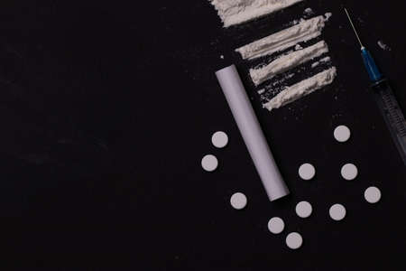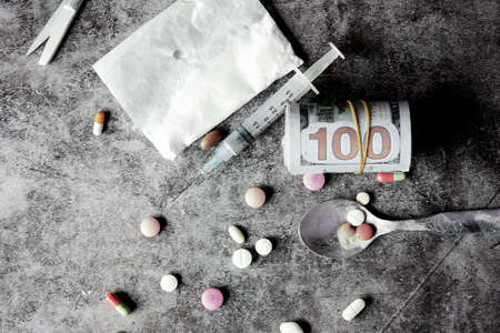 Syringe, powdered substance, pills and money on a black background. The concept of drug addiction, heroin or other drug use