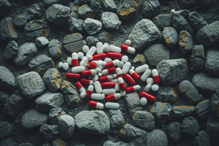 A pile of red and white pills is stacked on top of rocks, A symbolic representation of opioid misuse, AI Generated