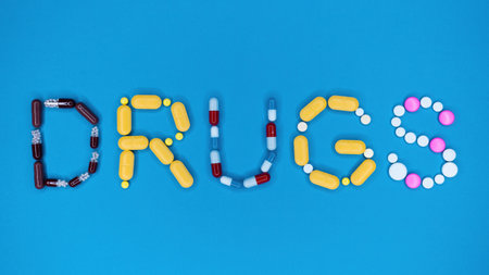 Multicolored capsules in word drugs. Blue background. Pharmacy, antidepressants, medicine concept.