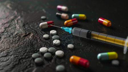 Addiction topic: ampoule with drug and syringe tablets lie on a dark background studio