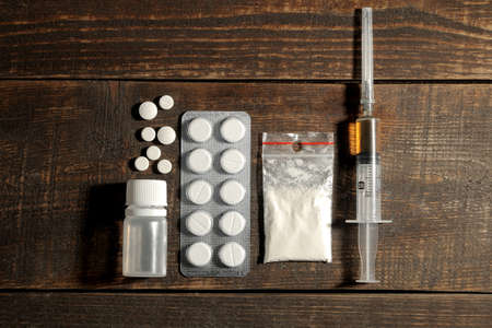 Various addictive drugs including alcohol, cigarettes, and drugs on a brown wooden table. view from above