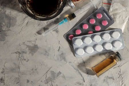 Hard drugs and alcohol on dark gray table. Alcohol pills syringe plastic bag powder of cocaine on table with shadow.Closeup.Copy space.