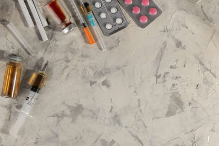 A lot of pills and syringe with injection as a symbol of choice antibiotics against vaccine from Covid-19. Insulin and pills for people to control sugar in the blood.
