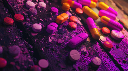 A captivating scene showcasing colorful medicine pills scattered on a rustic wooden surface, illuminated by soft lighting, creating a vibrant and artistic display perfect for health-related themes.
