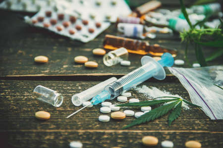 Pills, prohibited substances, addiction, say no to drugs. Drug addiction and substance concept.