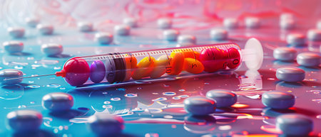 A white background is adorned with colorful pharmaceutical pills, capsules, ampoules, and syringes.