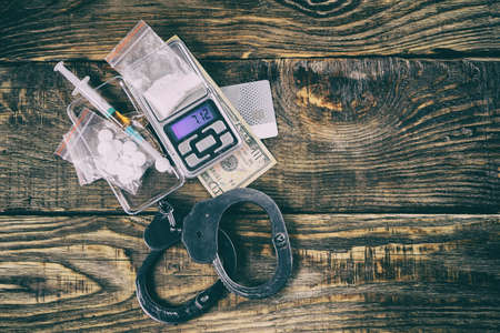Illegal drugs, money and handcuffs. Copy paste.
