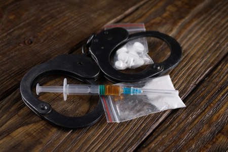 Drug injection syringe and cooked heroin in a bag on grungy wooden table