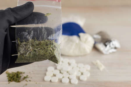 cocaine, heroin, spice, marijuana and etc - lots of unknown pills, white powder in a transparent package and the foil and similar to the spice mixture, hand in a black glove holding a packet with the Smoking mixture